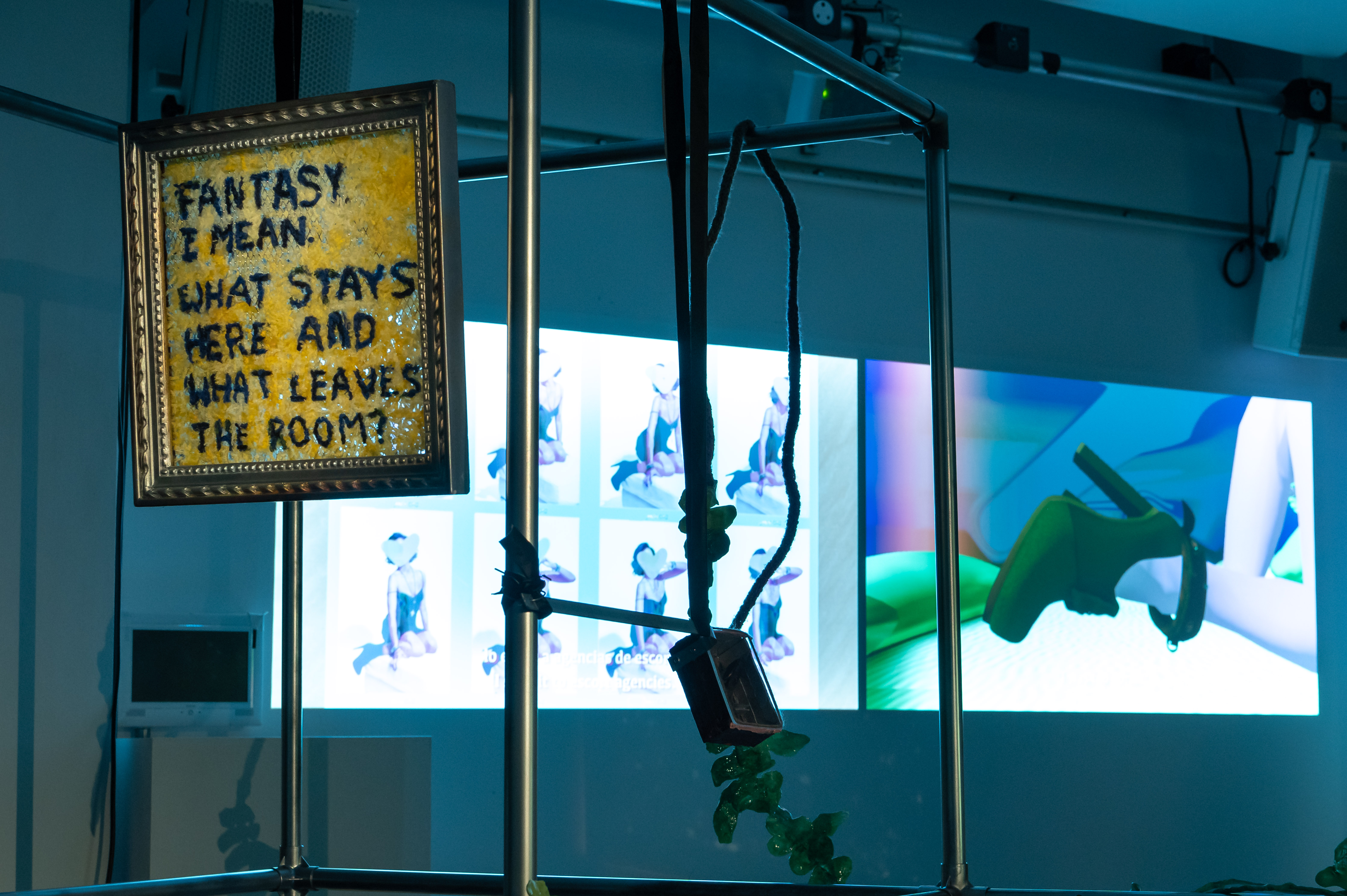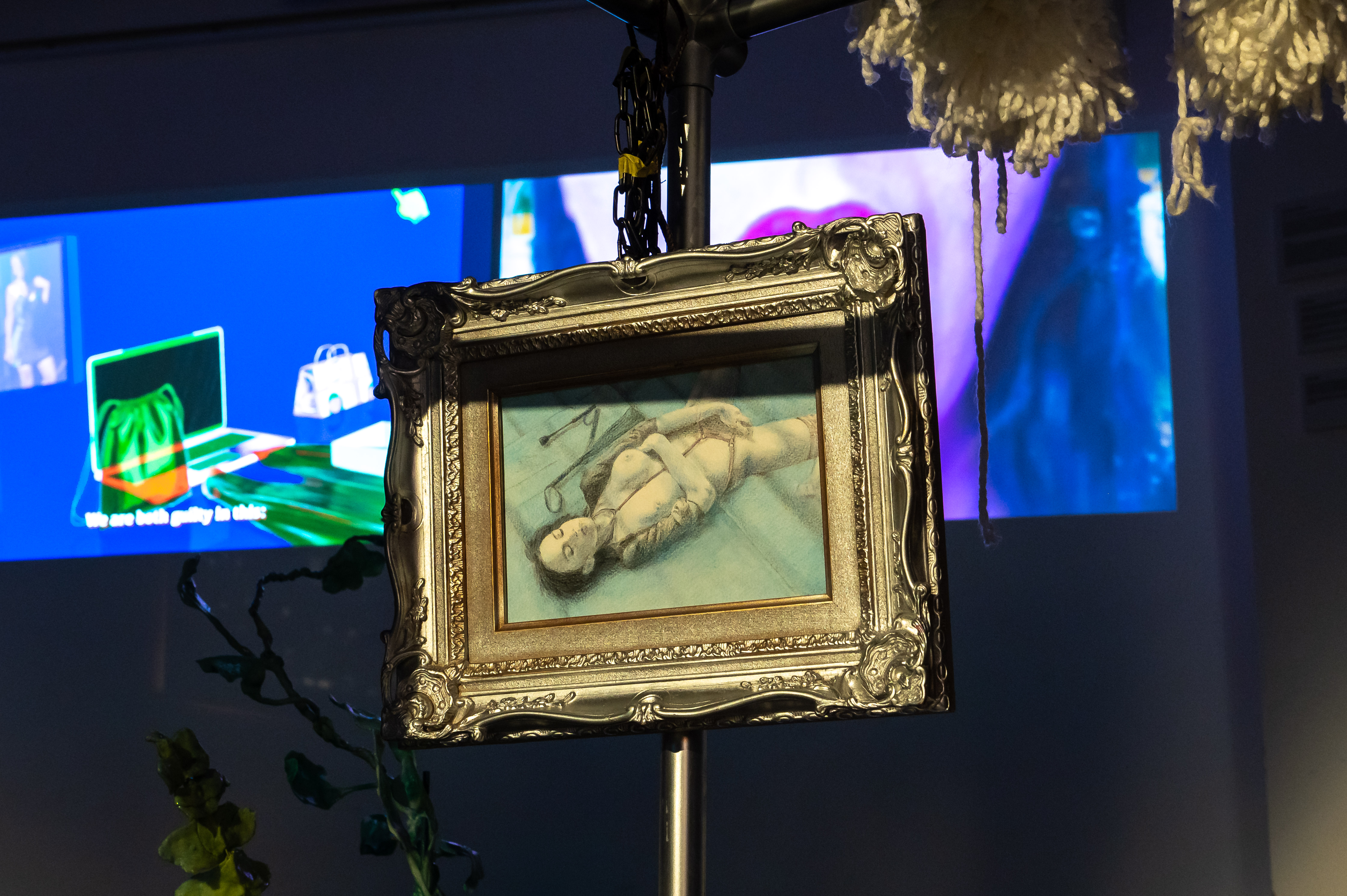 ....... Yarli translates their collaborative dialogues into a layered visual language, incorporating a mixture of ingredients from their conversations, which include gamification elements such as character-building menus that fulfill client fantasies, alongside split-screen compositions that symbolize the duality of Letizia’s role. The work juxtaposes virtual dungeons versus real bedroom during the pandemic (where does fantasy ends?), integrates archival photographs from Letizia’s early career promotion portfolio, and weaves together physical artworks: pencil drawings of Letizia, fluffy sculptures, surrealistic dioramas, comfy carpets, metal dividers, and tarot cards. The mixed-media installation evokes the shifting boundaries between the intimate and the transactional, the personal and the performative.
